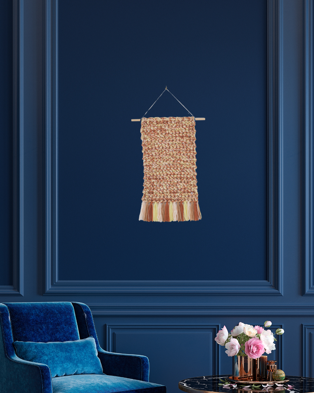 This crochet wall art is made with acrylic yarn, ensuring a soft yet durable finish. It is ideal for Hanging on walls, above beds, or as a statement piece in any cozy corner. It is extremely light, requiring a simple adhesive wall hook to hang effortlessly. A perfect gift for craft lovers!